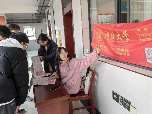 在发放材料的过程中团队成员也积极地为同学们答疑解惑。他们以生动的语言和鲜活的经历,分享了在大学期间学习和生活中的收获与感悟。此外,他们结合自身经历和个人专业学习感悟,围绕着如何选择专业、如何拓展兴趣爱好、如何处理人际关系等方面,向高中学弟学妹们传递了宝贵的经验和建议。此次宣讲活动不仅拓宽了高三学生的视野,深化了他们对专业选择等方面的认知,更激发了他们的学习热情和进取精神。