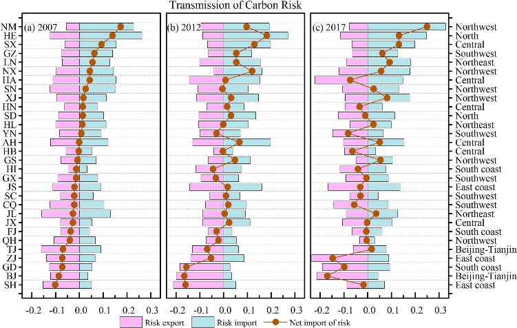 发展与减排是“双碳”目标下中国需要平衡的关键矛盾。迫于碳排放压力控制经济增长而造成潜在产出损失的碳风险会进一步通过贸易系统传播。这项研究通过构建碳风险指数评估区域碳风险水平,进而基于多区域投入产出模型量化省际贸易下的碳风险转移,最终揭示省际间碳风险的不对等变动。结果表明,2007-2017年间中国西北(内蒙古、宁夏、新疆)、北部(山东、河北)的碳风险水平始终较高。省际隐含碳流动与碳风险变动之间存在不平等性,这使得省际贸易下的碳风险变动并不对等,导致各省碳风险净进口量之和为正且持续增加。确定的风险传递价值矩阵有助于为各省份的减排行动提供支撑,风险传递价值低的省际贸易需要得到改善。内蒙古等欠发达地区在省际贸易中碳风险持续增加的过程被发现是难以逆转的,因而更需要从生产端减排以降低风险。