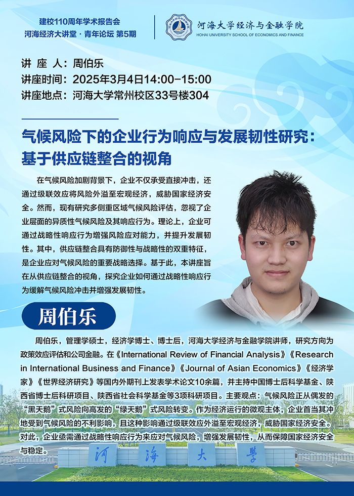 河海经济大讲堂·青年论坛 第5期|气候风险下的企业行为响应与发展韧性研究:基于供应链整合的视角